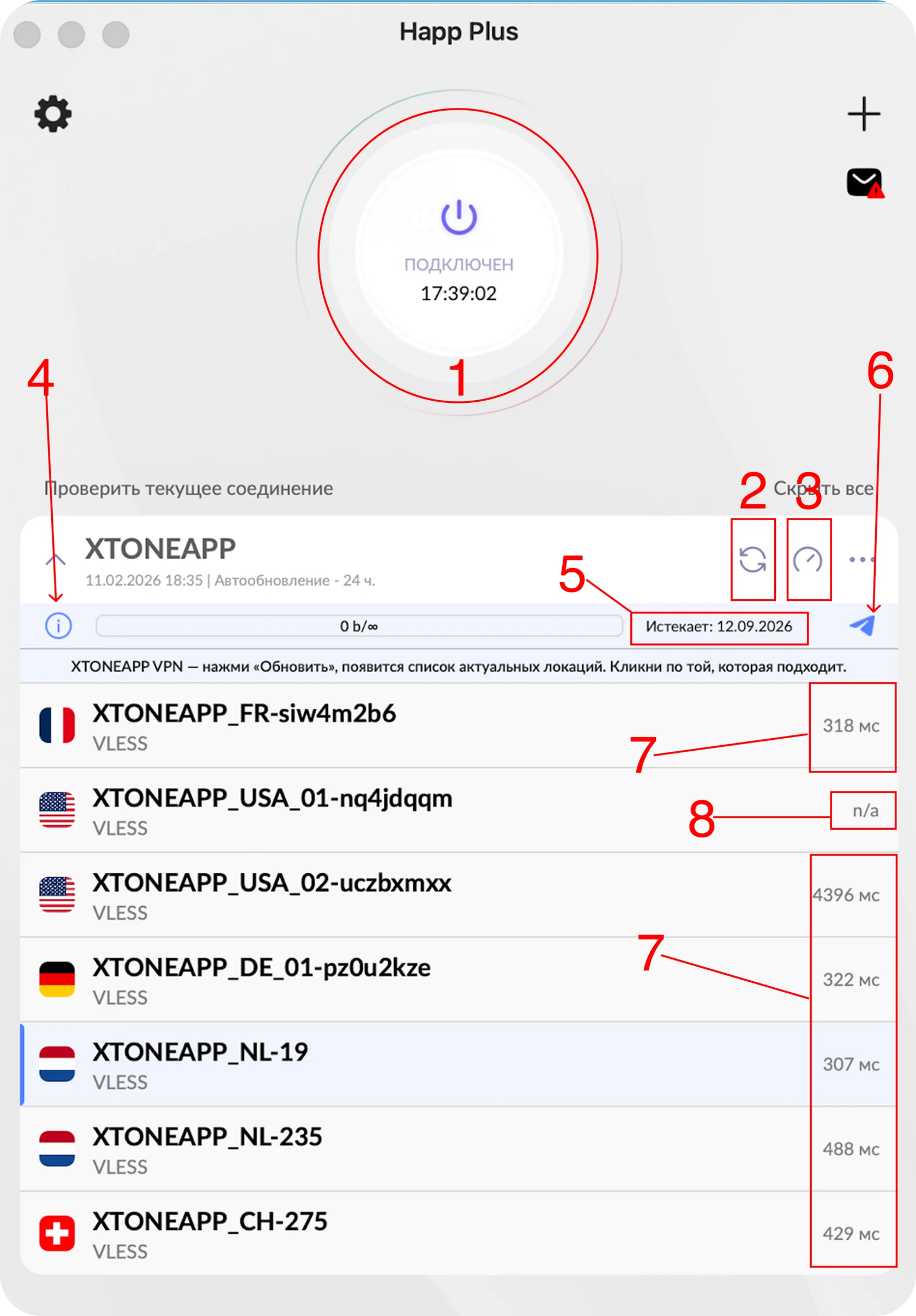 8. Если отображается — n/a, значит нет соединения с выбранной локацией. Обычно это временный сбой или техработы. Просто выберите другую локацию.